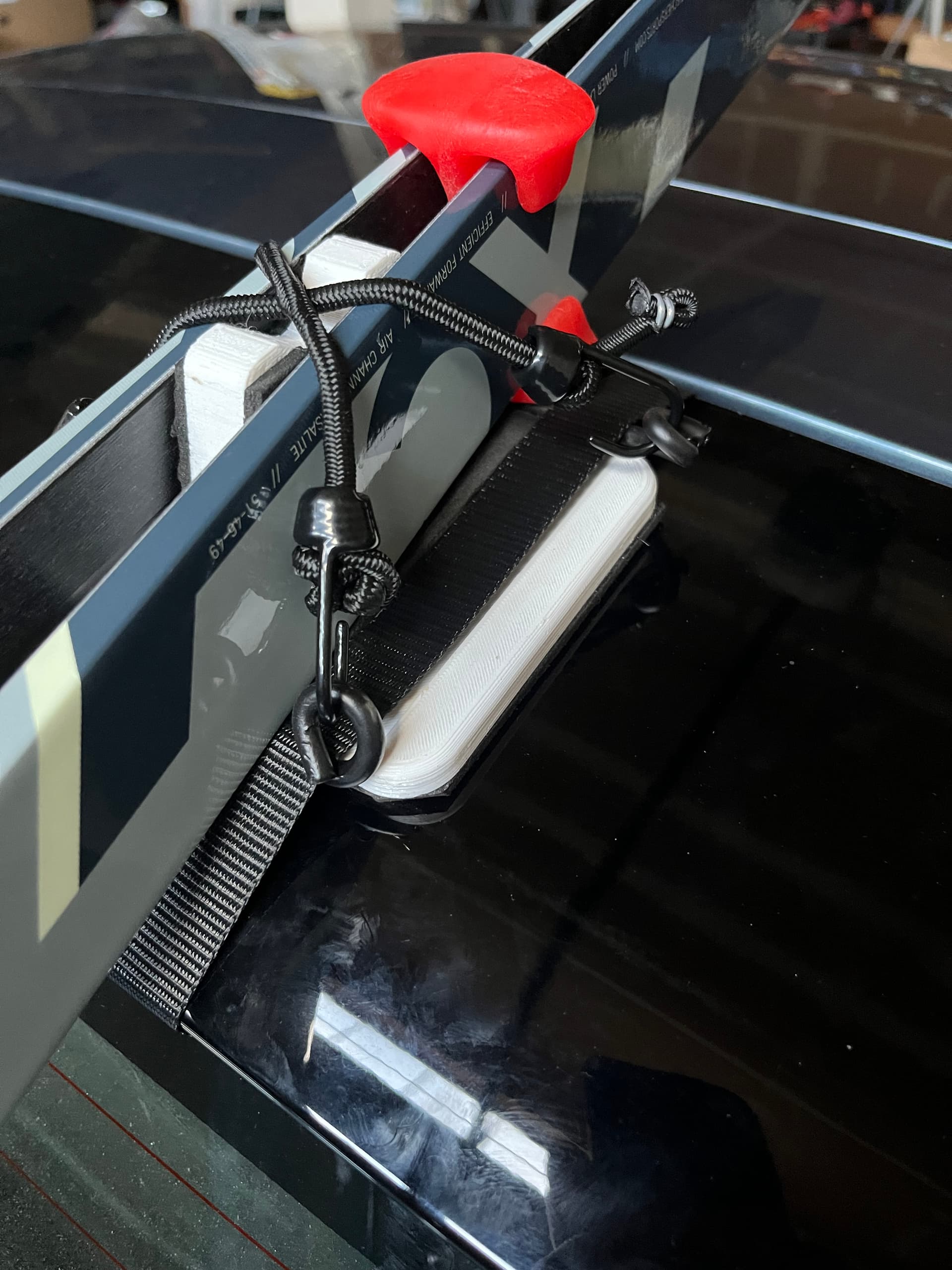 But the same company also makes a “boot bag” which secures to the trunk with straps. So, I borrowed that idea and made some brackets which can be held to the trunk and a part of the retractable hardtop roof with straps. The brackets have adhesive rubber foam padding added where they contact the car and the skis, to hopefully preclude any scuffing. Bungee cords wrap over the skis and attach to some bent-wire brackets that slip under the straps…everything seems pretty secure. The straps get stretched tight when the roof and trunk lid are closed. Took it out on the local main road and everything seems right, no noises or vibrations noted at about 50 mph. I’ll probably head up to the pass on Monday, and keep an eye on things with frequent stops to check. The pass is I-90 and has a 70 mph speed limit, so…wish me luck!