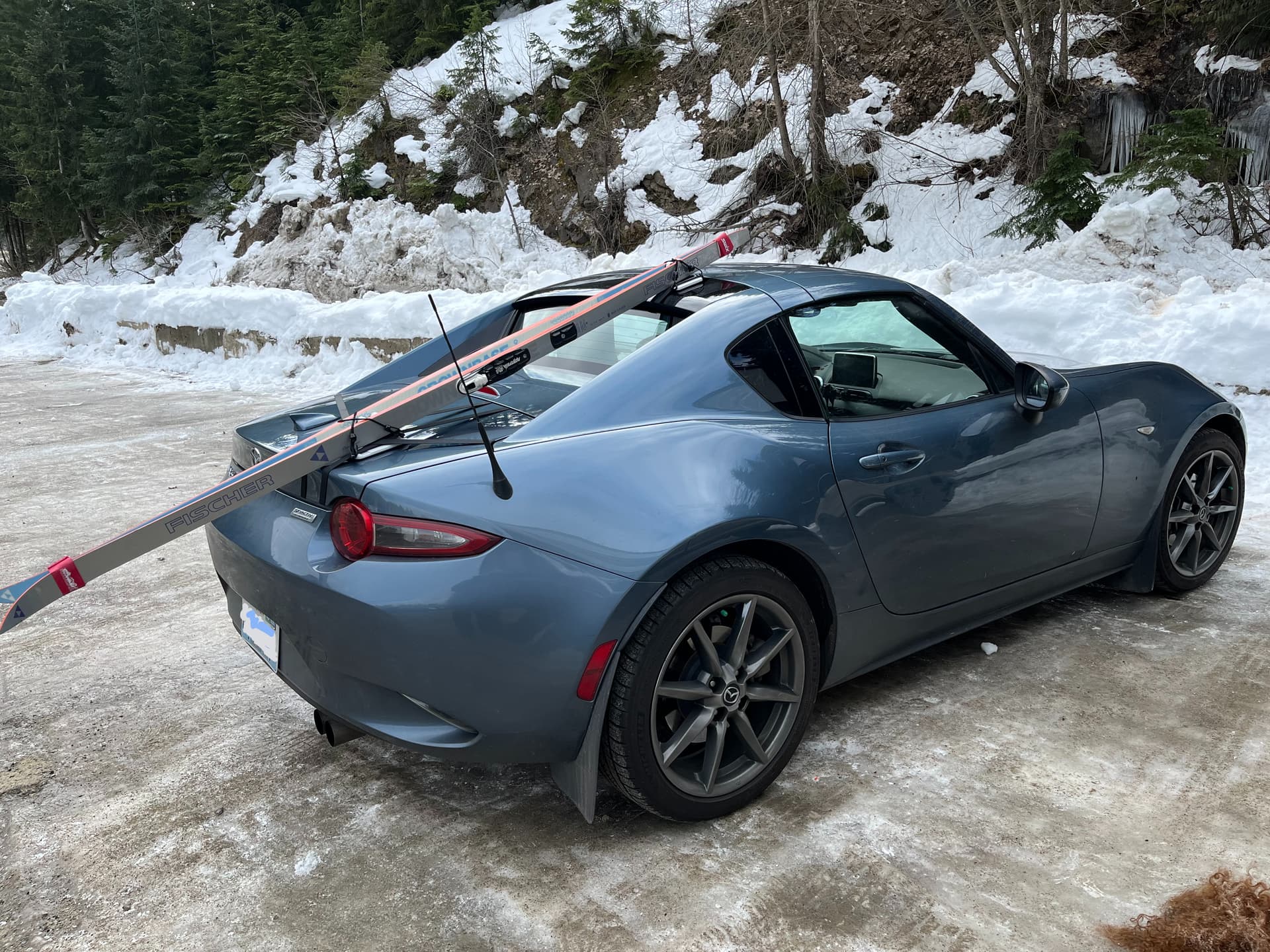Monday visit to the pass, with 40-yr old xc skis (because 1. if they fell off would not be broken hearted, and B. the snow reports said areas of the trails were bare). Bottom line - ski rack performed fine, no weird vibrations or noises, no evidence of chafing, etc. People who know that parking lot were amazed that the Miata got in and out (deep potholes and icy road surface), but it’s small and agile to get around the deeper stuff, the tires (M+S rated) have good grip, and the driver has had 40+ years of RWD+manual+snow.